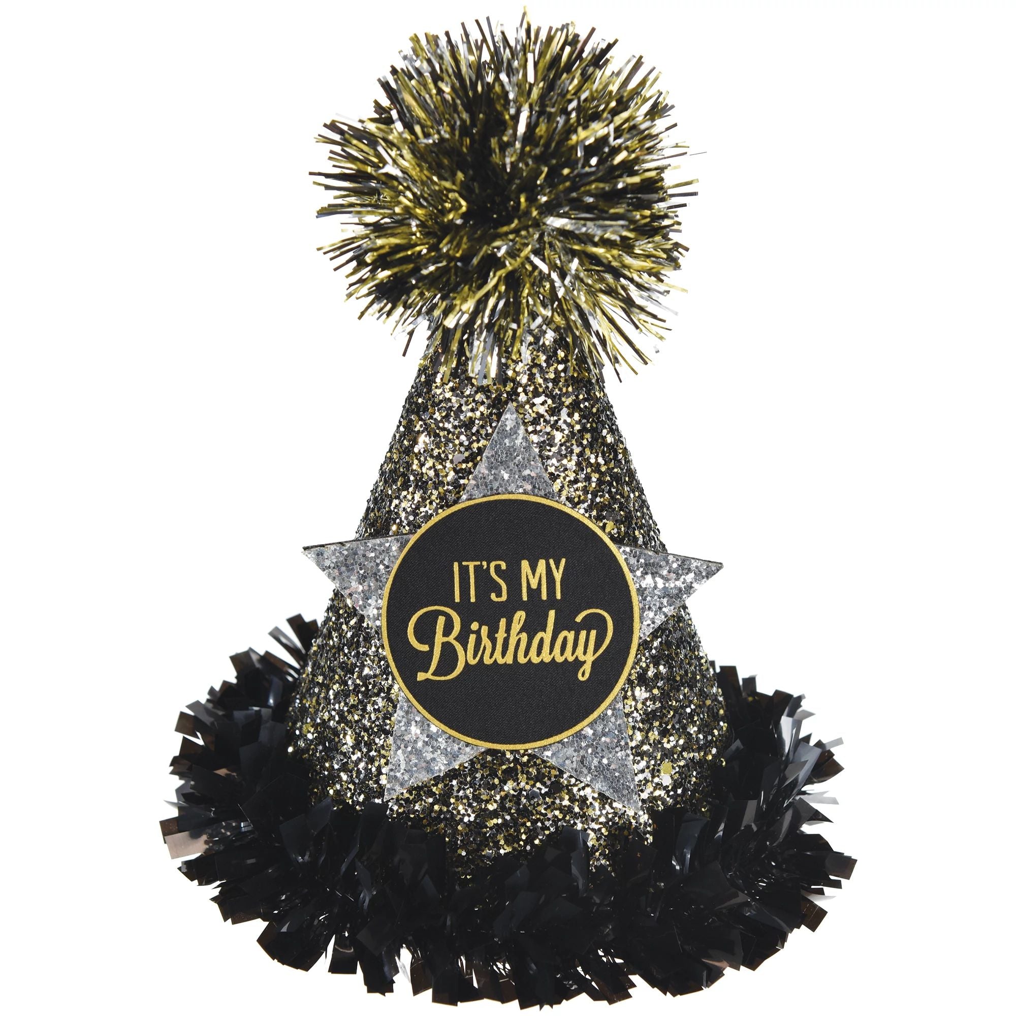 Celebrate in style with this stunning Cone Hat in Black, Silver, and Gold! At 7.5" tall, this sparkly party essential combines elegant metallic colors that shimmer and shine throughout your festivities. The glittering finish catches the light beautifully, making sure you're the star of the show at any happy birthday bash. Lightweight and easy to wear, this cone hat brings instant glamour and festive cheer to your celebration. Perfect for birthday parties, New Year's events, or any occasion that calls for a touch of sparkle and sophistication. Top off your party look and let the good times roll!