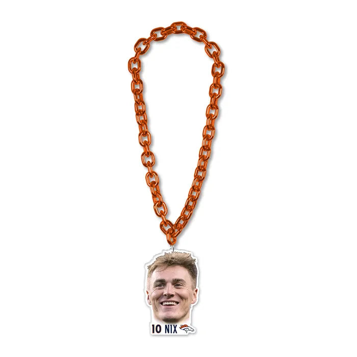 Rock your team spirit with the Denver Broncos Big Chain Necklace! This oversized statement piece features bold embossed and debossed foam graphics secured to a sturdy 38-inch plastic chain—perfect for game days, tailgates, and showing your pride. Lightweight and durable, it's the ultimate accessory for any Broncos fan ready to make a splash. Go Broncos!