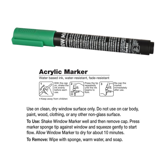 Perfect for creative minds of all ages, this green window marker brings vibrant color to glass surfaces both inside and out. The washable formula means your masterpieces won't stick around permanently—just wipe clean with water when inspiration strikes elsewhere. Non-toxic and easy to clean, it's ideal for seasonal decorations, classroom projects, or spontaneous artistic expressions. Whether you're decorating storefront windows or creating temporary art on home glass, this versatile marker delivers bold, playful results without the permanent commitment.