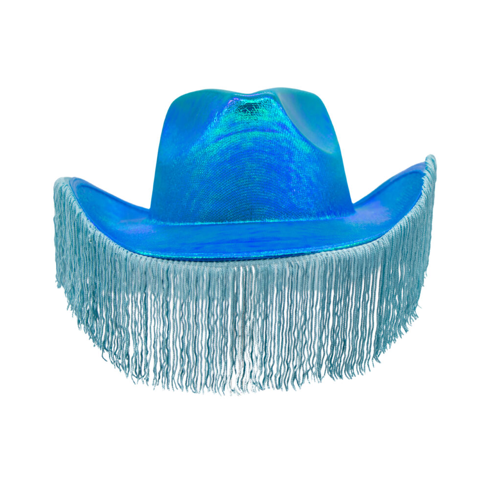 Saddle up in style with this eye-catching Fringe Metallic Cowboy Hat in shimmering turquoise blue! Perfect for rodeos, festivals, or anyone ready to turn heads, this hat combines classic Western flair with a modern metallic twist. The playful fringe detailing adds movement and personality to every step. Whether you're hitting the dance floor or making a bold fashion statement, this hat delivers serious fun with serious sparkle. Yeehaw!