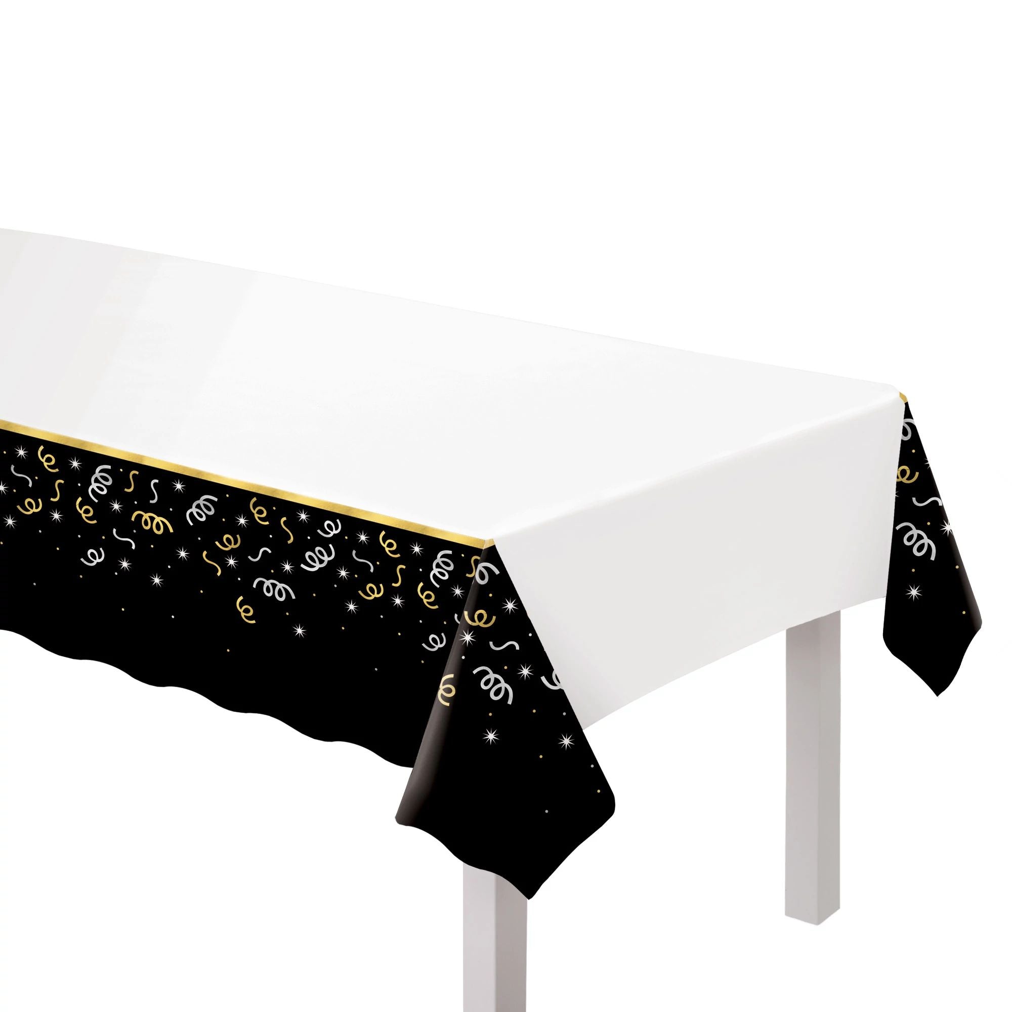 Bring the party to life with this Midnight Cheers Plastic Table Cover! Measuring a generous 54" x 102", it's the perfect size for standard banquet tables. This durable plastic cover protects your table from spills and mess while adding festive flair to your celebration. Easy to wipe clean and reusable, it's an essential addition to any gathering. Whether you're hosting an elegant dinner or a casual get-together, this sleek midnight-themed cover sets the mood for an unforgettable night of cheers and good times.