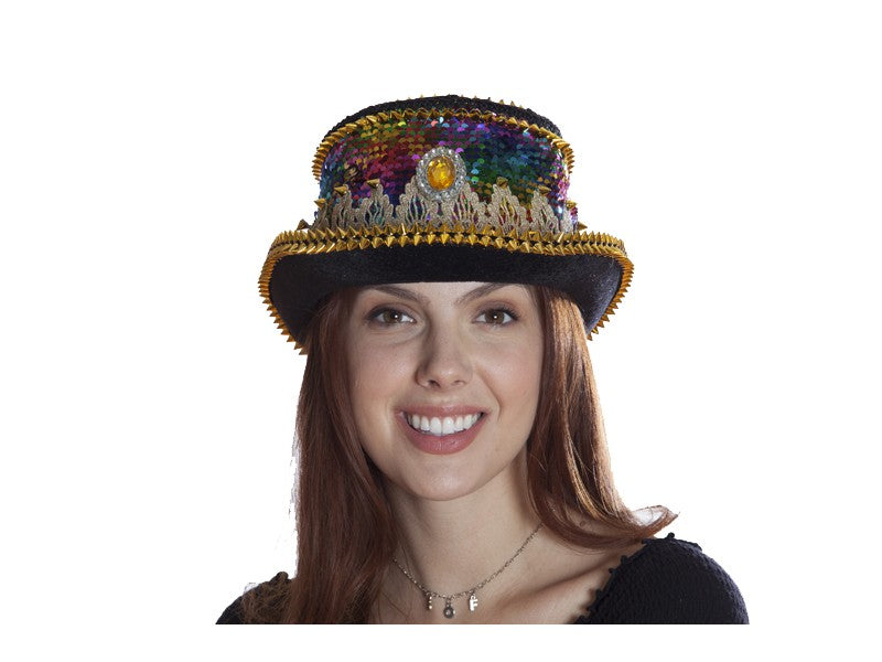 This rainbow sequin and lace top hat is perfect for burning man or a rave. Covered in rainbow sequins, gold studs, and adorned with a big jewel on the front, you will surely catch everyone's eye with this amazing hat!
