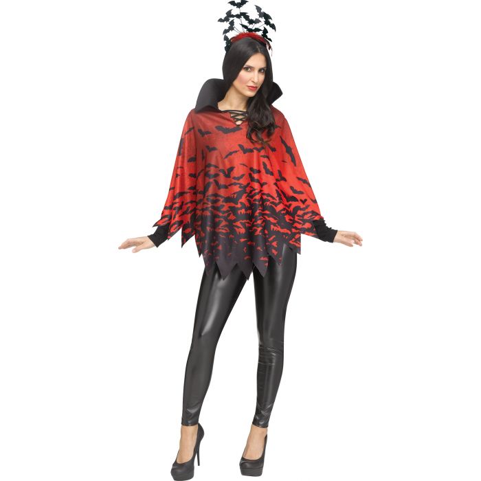 Ready to get your Batman on? Throw on the Vamp Poncho - Adult and become the dark knight of the night! This stand-up vamp collar poncho with saw-toothed edges and a menacing black bat print will turn heads wherever you go. And with a sultry V-Lacing in front, you'll be ready to save the day (or night!). Collar and poncho included - headband not included. Vamp your style and get ready for bat-tastic adventures!