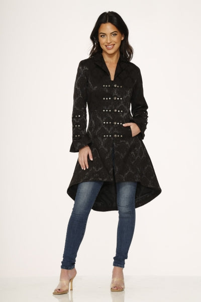 Turn heads in the Orchid Bloom Coat, where vintage glamour meets modern edge. This striking brocade jacket features a plunging V-neck with delicate lace trim, bold military-inspired metal buttons, and dramatic bell sleeves adorned with ruffles. The showstopping back showcases a criss-cross lace-up design with an elegant extended tail, all trimmed in romantic lace. Sexy, sophisticated, and undeniably unforgettable—your new favorite statement piece awaits.