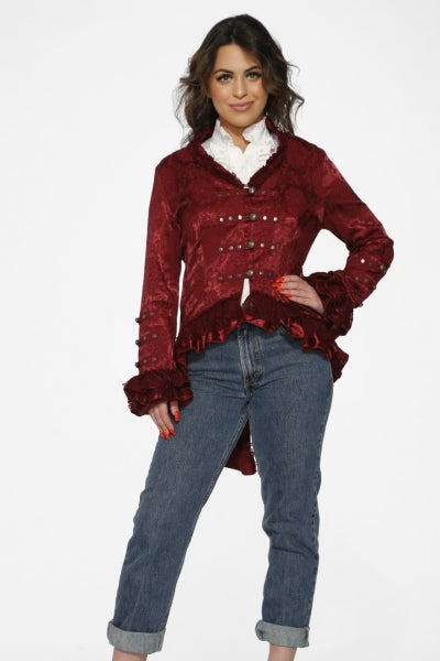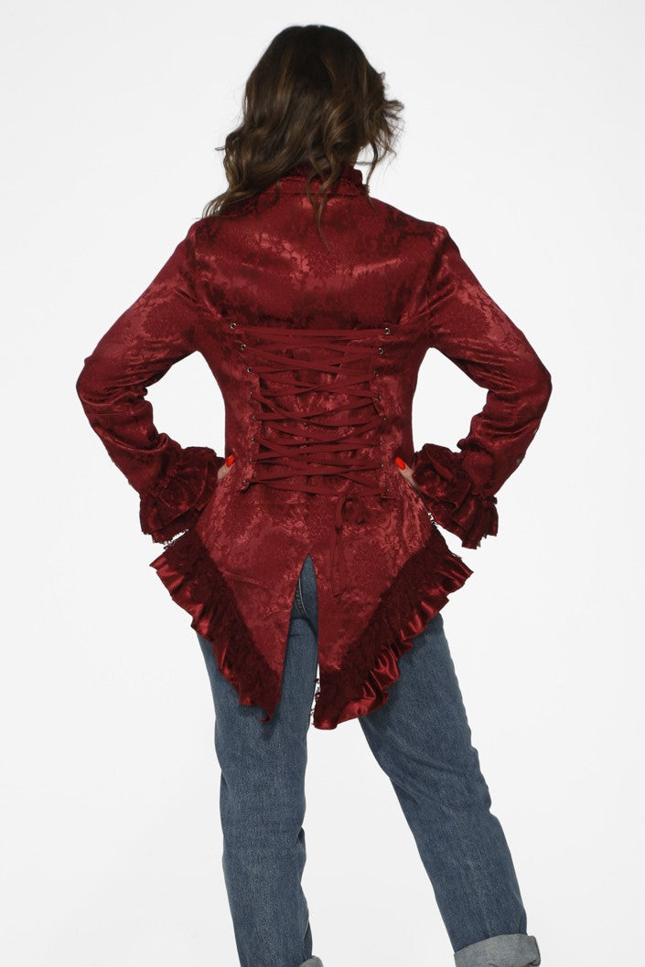 Elevate your wardrobe with this stunning burgundy brocade tailed jacket—the perfect blend of vintage glamour and modern sass. Featuring an eye-catching brocade pattern in rich burgundy tones, this jacket boasts dramatic tails that add flair to any outfit. Whether you're heading to a special event, a night out, or just want to turn heads, this piece delivers serious style points. The tailored fit flatters your silhouette while the luxe fabric ensures you'll feel as fabulous as you look. Make a statement and own the room!